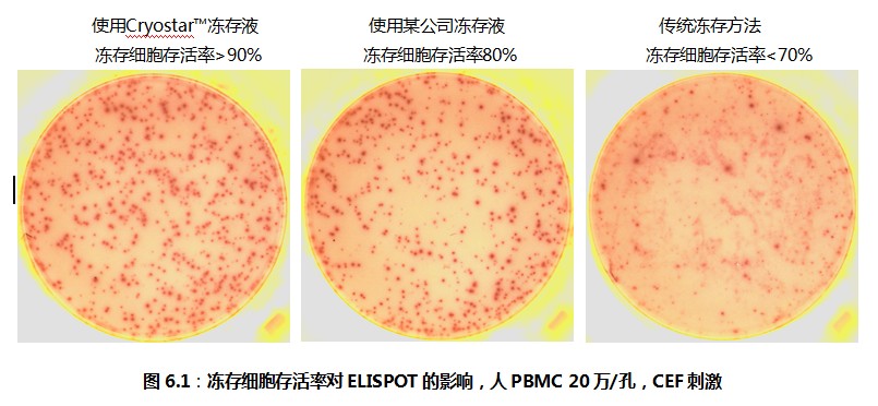 考慮到ELISPOT檢測(cè)的特殊性,荷蘭U-CyTech公司經(jīng)過精心的研究與反復(fù)的驗(yàn)證,推出了Cryostar?凍存試劑盒,在凍存液中添加了一系列對(duì)細(xì)胞有特殊保護(hù)作用的保護(hù)劑。達(dá)科為公司在接到Cryostar?凍存試劑盒之后,在我們的實(shí)驗(yàn)室以及國內(nèi)數(shù)家客戶的實(shí)驗(yàn)室做了細(xì)胞凍存與復(fù)蘇的實(shí)驗(yàn),并且對(duì)復(fù)蘇之后的細(xì)胞做了ELISPOT檢測(cè)。結(jié)果表明,淋巴細(xì)胞的存活率超過90%,ELISPOT斑點(diǎn)形成頻率與新鮮細(xì)胞完全相同。參見圖6.1。