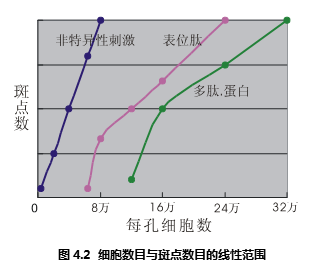 非特異性的刺激物可以直接刺激淋巴細胞,這種刺激不依賴于APC或者其它輔助細胞,是單細胞反應(yīng)行為。所以它對細胞密度沒有要求,在極寬的細胞濃度范圍之內(nèi)——多至40萬/孔,低至5千/孔——斑點數(shù)量和細胞數(shù)量都有簡單的正比例關(guān)系,參見圖4.2。但是考慮到,只有恰當(dāng)?shù)陌唿c數(shù)目才便于數(shù)據(jù)統(tǒng)計,所以推薦細胞密度為10萬/孔。如果細胞數(shù)目過多,滿孔都會被斑點覆蓋,并且相互重疊。